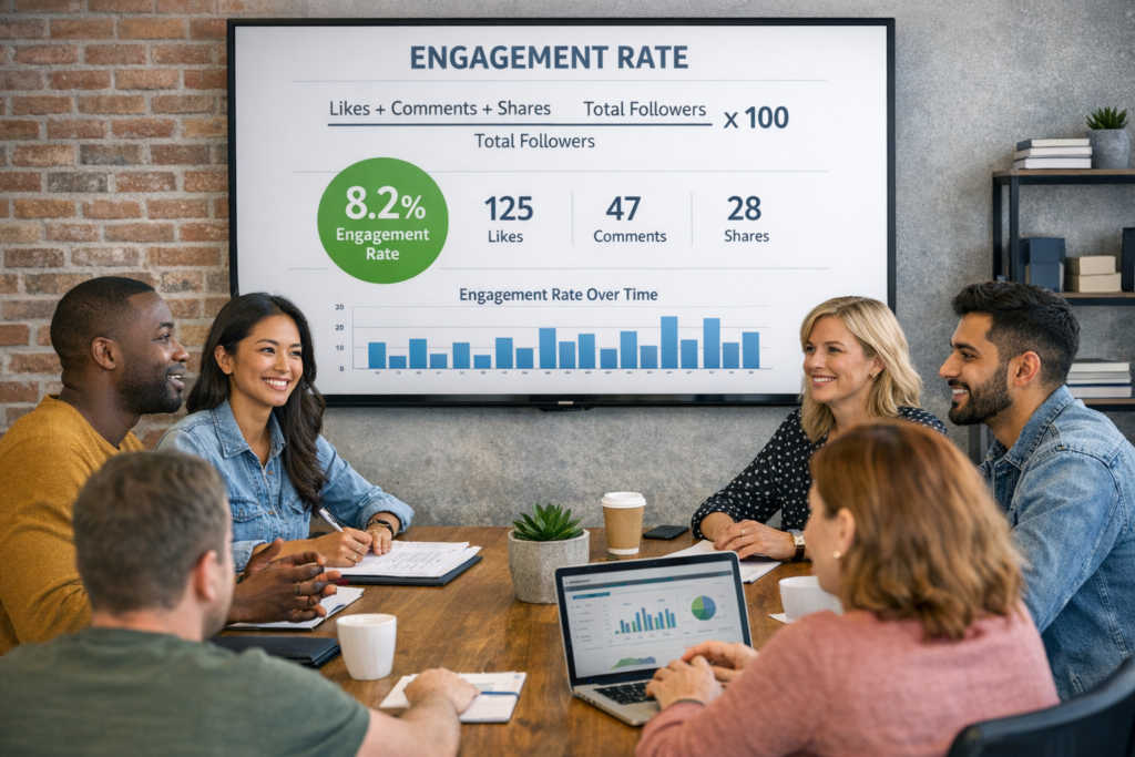 Engagement Rate is the ratio of meaningful interactions to total exposures within a defined channel and time window: