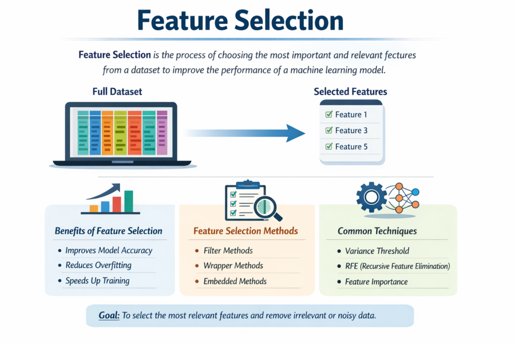 Feature Selection is the systematic process of identifying, scoring, and retaining the most informative variables from your raw dataset while discarding the rest. It differs from feature engineering (creating new variables) by focusing on what to keep rather than what to build. A robust feature-selection pipeline typically involves: