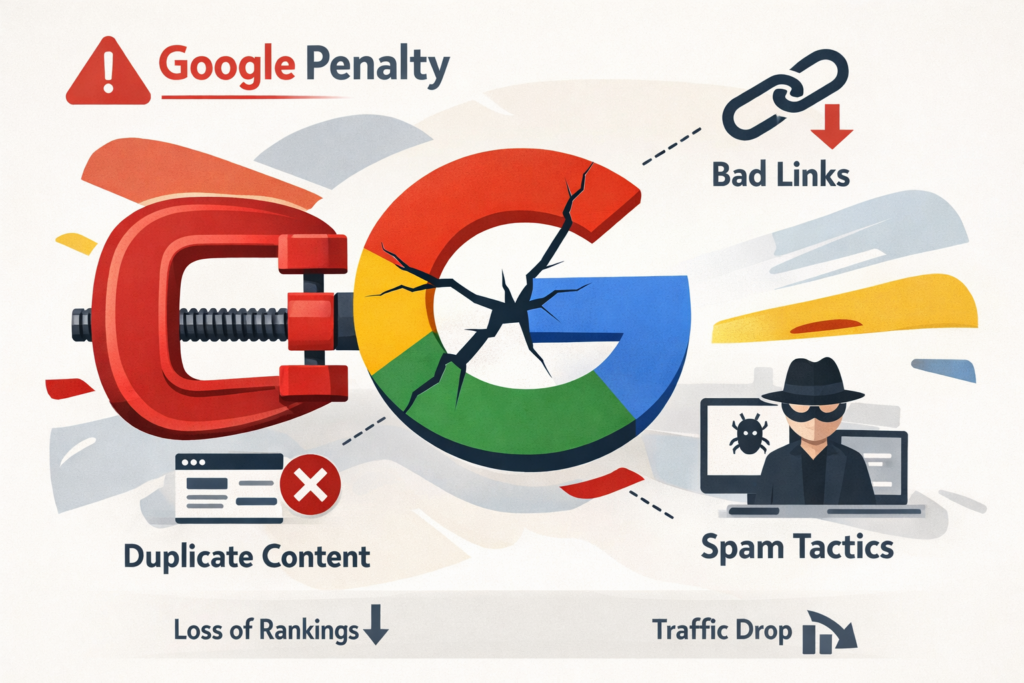 A Google Penalty is a manual action or algorithmic filter applied by Google that lowers or removes a site’s rankings because it violates the search engine’s Webmaster Guidelines. Penalties come in two flavors: