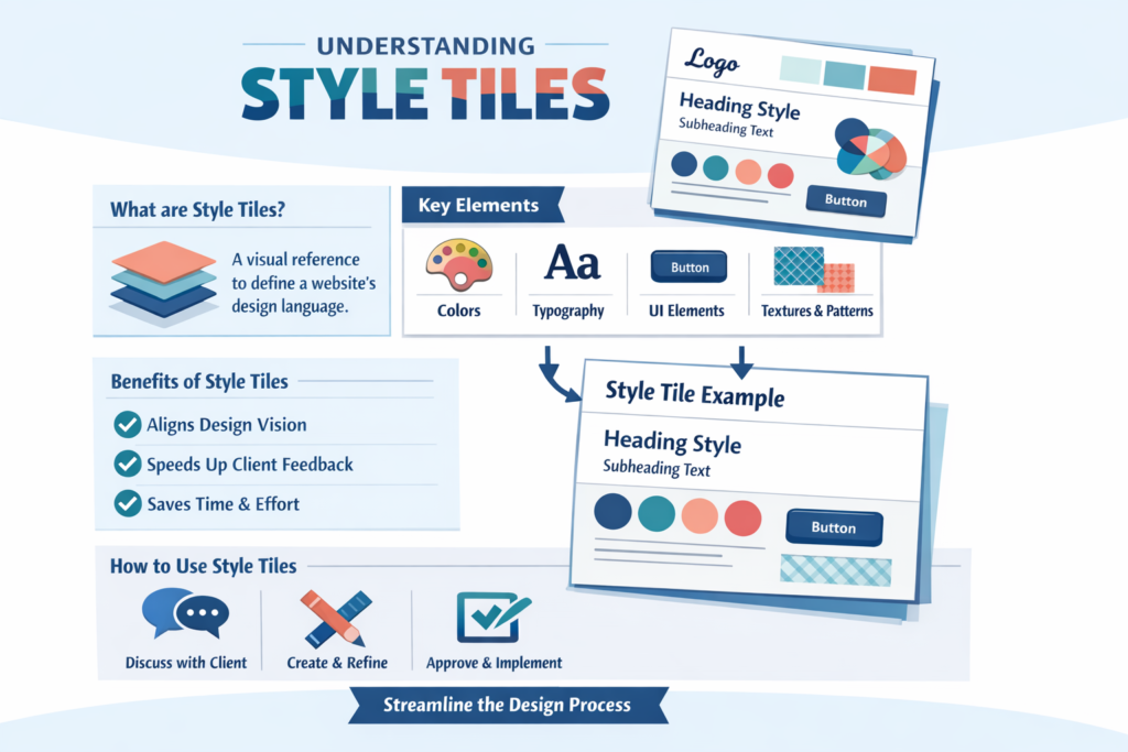 A Style Tile is a one-page, non-layout design artifact that samples the core ingredients of a digital brand—colors, typography, UI atoms, iconography, textures, and tone—for stakeholder approval before full comps or code. Think of it as a digital interior-design board: fabric swatches, paint chips, and fixtures arranged so everyone agrees on the vibe before walls go up.