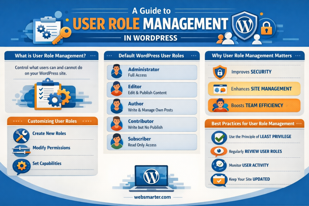User Role Management is the structured process of creating, assigning, auditing, and retiring permission sets within a website’s CMS, server, or SaaS stack. A mature URM program includes: